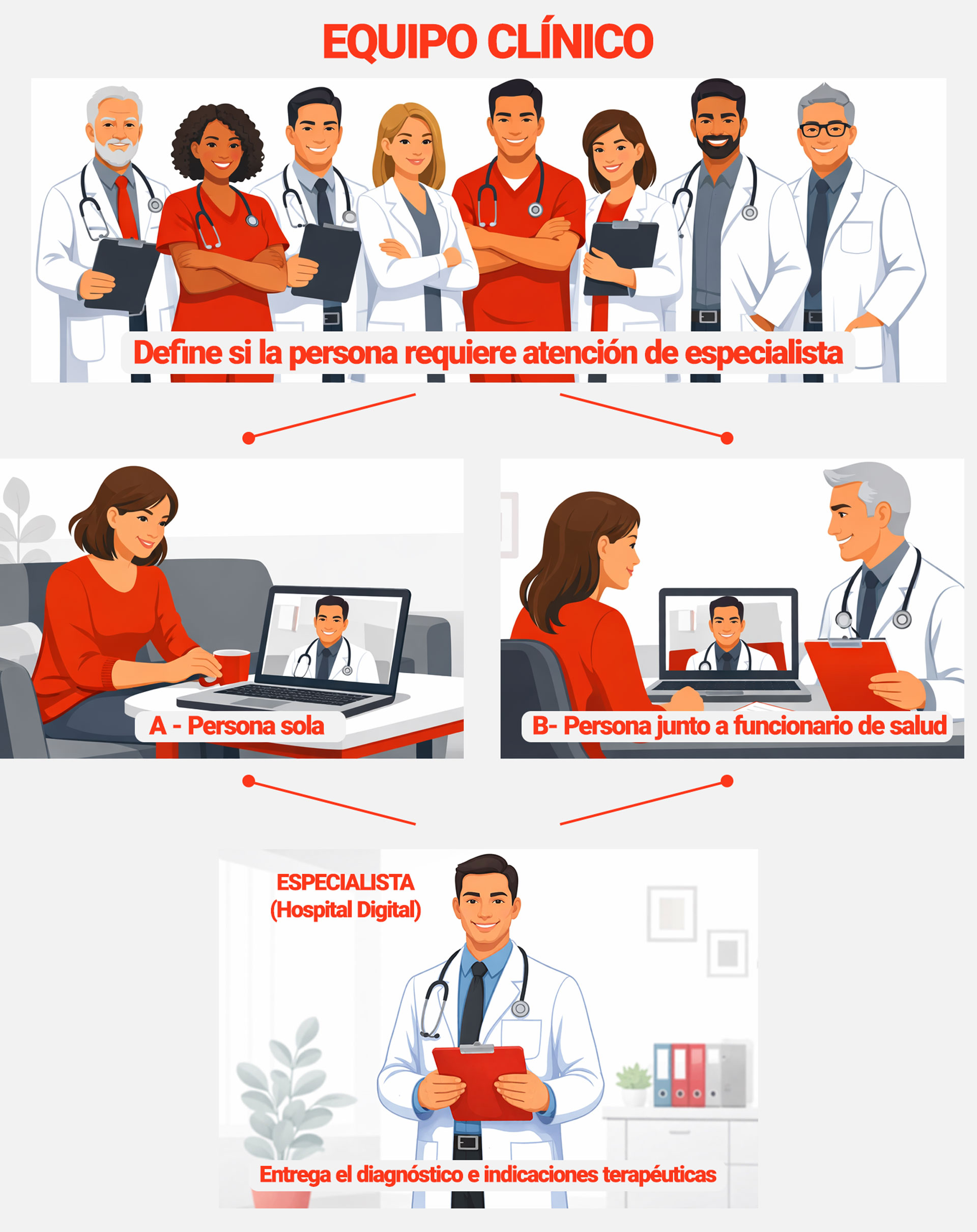Relación directa a través de videollamadas en tiempo real, entre un profesional de salud del prestador y el usuario final, sin necesidad de intermediarios.